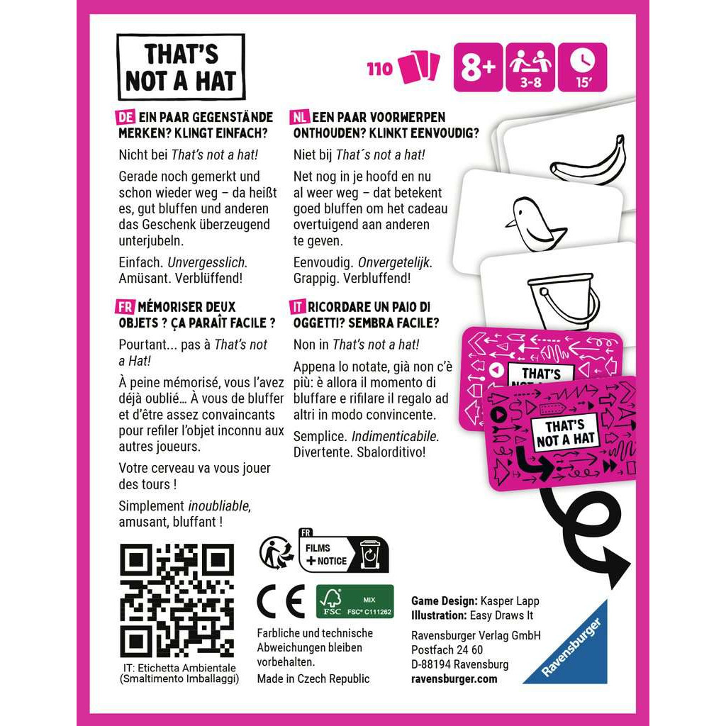 That’s not a Hat est un jeu familial qui fera rire toutes les générations de la famille. Mémorisez les cadeaux en jeu et offrez-les vous… Mais attention vos voisins peuvent refuser votre cadeau et vous le renvoyer. Si vous ne souvenez plus du cadeau que vous offrez, bluffez bien ! That’s not a hat est un jeu dans lequel vous allez devoir retenir de plus en plus de carte… Si vous n’y parvenez pas soyez convaincant en bluffant vos voisins !