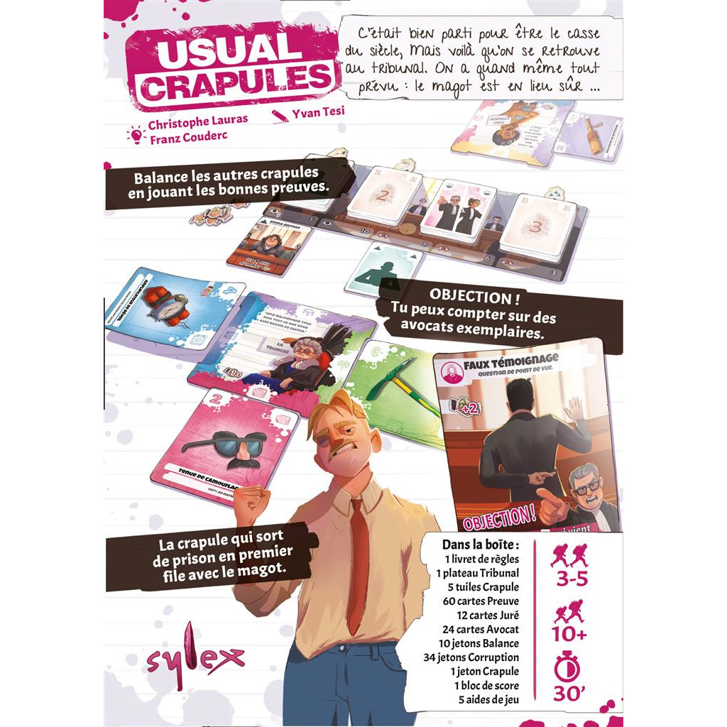 Usual Crapules vous embarque dans une ambiance de procès survolté entre anciens braqueurs. Après un casse raté, les joueurs se retrouvent devant le juge : celui qui écopera de la peine la plus courte pourra aller déterrer le magot avant les autres.